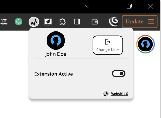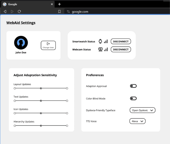 We built a functional prototype demonstrating the extension UI — the popup panel, settings controls, and adaptation feedback dialog.
